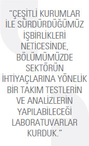 Öğrencilerimizin bu laboratuvarları en etkin şekilde kullanabilmeleri için gerek yönlendirilmeye gerekse de teşvik edilmeye ihtiyaçları var. Tüm bunların farkındayız ve dört yıllık müfredatımızı bu şekilde kurguluyoruz. Bölgemizde otomotiv sektöründe faaliyet gösteren önemli kurumlar var. Bu kurumlar ile yürüttüğümüz işbirlikleri neticesinde, bölümümüzde otomotiv sektörünün ihtiyaçlarına yönelik birtakım testlerin ve analizlerin yapılabileceği bir laboratuvar kurduk. Yine bölgemizdeki plastik boru üreticilerinin ihtiyaçlarına cevap verebilecek, çeşitli mekanik ve hidrolik testlerin yapılabildiği bir laboratuvarımız mevcut. Bunların dışında bölümümüzde başta güneş enerjisi olmak üzere yenilenebilir enerji alanındaki araştırmalarda ve ürün testlerinde kullanılmak üzere laboratuvar oluşturma sürecimiz de devam ediyor. Tüm bunların dışında öğrencilerimizin kullanımına 24 saat açık eğitim laboratuvarlarımızda mekanik, termodinamik, ısı transferi ve akışkanlar mekaniğinin temel prensiplerinin test edildiği deney düzeneklerimiz mevcut.