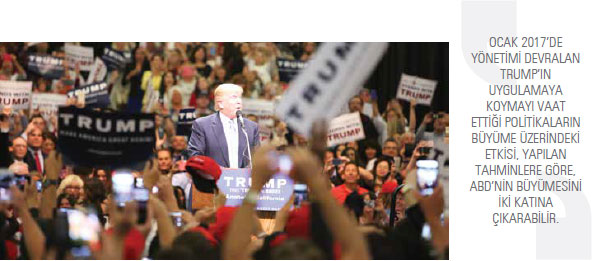 Yalnızca serbest ticaret değil aynı zamanda diğer maliye politikalarıyla birleştirildiğinde, Ocak 2017’de yönetimi devralan Trump’ın uygulamaya koymayı vaat ettiği politikaların büyüme üzerindeki etkisi, yapılan tahminlere göre, ABD’nin büyümesini iki katına çıkarabilir. Bu düzeyde bir etkiyi doğuracak politikaların başında, gevşek bir mali politika geliyor. Trump’ın altyapı yatırımlarına ağırlık veren mali genişleme politikası, beraberinde daha güçlü dolar ve yüksek faiz senaryosunu da hayata geçirecektir. ABD ekonomisinin aşırı ısınmasına bağlı olarak FED’in 2017 yılında faiz artırımında daha kararlı davranacağına olan inancın kuvvetlenmesi ise dünyanın geri kalan kısmında ve özellikle gelişme yolundaki ülkelerde durgunluk ve borç krizlerini beraberinde getirebilir.