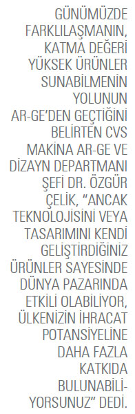 CVS Makina, 2010 yılından bu yana Ar- Ge faaliyetlerini sürdürüyor. Bilim, Sanayi ve Teknoloji Bakanlığına 2013 yılında resmi müracaatını yapan firma, aynı yıl Ar-Ge merkezi için lisans aldı. 700 metrekarelik bir alanda faaliyet gösteren CVS Makina Ar-Ge Merkezinde 35 kişilik bir ekip görev alıyor. Çok sayıda projeyi başarıyla tamamlayan merkezin bütçesi her yıl artırılarak, özellikle demir-çelik sektörüne yönelik yenilikçi ürünlerin geliştirilmesi hedefleniyor. CVS Makina Ar-Ge ve Dizayn Departmanı Şefi Dr. Özgür Çelik, merkezin yapısı, odaklandığı alanlar ve proje çalışmaları özelindeki sorularımızı yanıtlayarak hedefleriyle ilgili bilgi verdi.