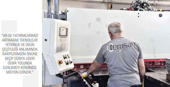 Kahramanmaraş Organize Sanayi Bölgesi’nde 19 bini kapalı olmak üzere 26 bin 985 metrekarelik alanda 197 personelle faaliyetlerini sürdürdüklerini aktaran Erdoğrul, şöyle devam ediyor: “Temsan Makina olarak makine, otomasyon-yazılım ve tamamlayıcı ürünler olmak üzere üç ana başlıkta üretim gerçekleştiriyoruz. Tekstil klima, dokuma tesis ve telef toplama ürünlerimiz; makine ana başlığı altındaki imalat kalemlerimizi oluşturuyor. Geleceğe yönelik teknolojik araştırmalar yapmak; enerji tasarrufu sağlayan çevre dostu teknolojileri geliştirerek buna bağlı olarak sürdürülebilir bir sistemin yürütücüsü olmak; sistemimizde kalite, standart ve verimlilik artışı sağlamak; araştırma eksenli teknolojik bilgi ve tecrübeyi ekonomik yarara dönüştürmek, rekabet gücünü artırıcı ürün geliştirme çalışmaları yürütmek ve personel eğitimlerine önem vererek katma değeri yüksek projeler geliştirmek, firmamız bünyesinde Ar-Ge merkezi kurulmasının temel nedenleri arasında bulunuyor.”