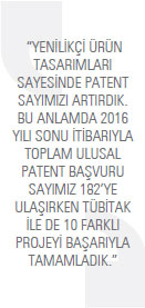 2016 yılı sonu itibariyle toplam ulusal patent başvuru sayımız 182’ye ulaştı. Bu başvurunun 21’i 2015 yılına ait. TURAŞ olarak patent stratejilerine dayalı bir Ar-Ge anlayışımız var. Her yılın başında Türk Patent ve Marka Kurumu’na (TPE) yapılacak patent başvuru sayısıyla ilgili kendimize bir hedef koyuyor ve o hedefe ulaşmak için sene sonuna kadar yoğun emek harcıyoruz. Bundan sonra da bu anlayışımızı devam ettireceğiz.