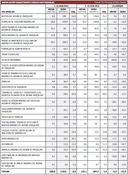 Makine sektöründe 2016 yılının 1-31 Ocak döneminde en fazla ihracat gerçekleştiren alt sektör motorlar, aksam ve parçaları oldu. 2016 yılının 1-31 Ocak döneminde söz konusu ürün grubunda gerçekleştirilen ihracatın değeri 136,8 milyon dolar olarak kaydedildi. Listenin ikinci sırasında bulunan klimalar ve soğutma makineleri kaleminde 2016 yılının 1-31 Ocak döneminde gerçekleştirilen ihracatın değeri 104,8 milyon dolar oldu. En fazla ihracat gerçekleştiren üçüncü kalem ise diğer yıkama ve kurutma makineleri aksam ve parçaları olarak kayda geçti. 2016 yılının 1-31 Ocak döneminde diğer yıkama ve kurutma makineleri aksam ve parçaları ürün grubundaki ihracat 91,6 milyon dolar olarak kayda geçti.