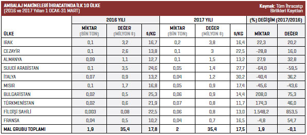 Ambalaj makineleri ürün grubunda 2017 Ocak-Mart döneminde 35,4 milyon dolarlık ihracat gerçekleştirildi. Ambalaj makineleri mal grubunda 2017 yılının Ocak- Mart döneminde 3,8 milyon dolarla en fazla Irak’a ihracat gerçekleştirildi. Söz konusu ülkeye 2016 yılının aynı döneminde ihraç edilen ürünlerin değeri 3,2 milyon dolar seviyesindeydi. Irak’a yönelik ihracat artışı yüzde 20,2 oldu. Listenin ikinci sırasında ise Cezayir bulunuyor. 2016 yılının Ocak-Mart döneminde Cezayir’e ihraç edilen ürünlerin değeri 2,6 milyon dolarken 2017 yılının aynı döneminde bu rakam yüzde 16 artışla 3 milyon dolar olarak kaydedildi. Üçüncü sıradaki Almanya’ya 2016 yılının Ocak-Mart döneminde 1,1 dolar değerinde ambalaj makinesi ihraç edilirken 2017 yılının aynı döneminde bu rakam yüzde 32,8 artışla 1,5 milyon dolar oldu. Listenin dördüncü ve beşinci sırasında ise Suudi Arabistan ve İtalya yer alıyor. Dördüncü sıradaki Suudi Arabistan’a 2017 yılının Ocak-Mart döneminde 1,4 milyon dolar değerinde ürün gönderildi. Beşinci sıradaki İtalya’ya ise 2016 yılının Ocak-Mart döneminde ihraç edilen ürünlerin değeri 940 bin dolar olarak kaydedilirken 2017 yılının aynı döneminde bu rakam yüzde 36,2 artışla 1,2 milyon dolar oldu.