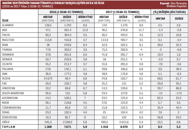 Hadde ve döküm makineleri mal grubunda 2017 yılının Ocak-Temmuz döneminde 27,1 milyon dolarla en fazla Almanya’ya ihracat gerçekleştirildi. 2016 yılının aynı döneminde bu rakam 17,9 milyon dolar seviyesindeydi. Almanya’ya yönelik ihracat artışı yüzde 51,8 oldu. Listenin ikinci sırasında yer alan Rusya’ya 2016 yılının Ocak-Temmuz döneminde 10 milyon dolarlık ihracat gerçekleştirilirken 2017 yılının aynı döneminde bu rakam yüzde 63,2 artışla 16,3 milyon dolar olarak kayda geçti. Üçüncü sıradaki İran’a 2016 yılının Ocak- Temmuz döneminde yapılan ihracat 10,6 milyon dolardı. İran’a 2017 yılının Ocak- Temmuz döneminde yüzde 5,1 lik artışla 11,1 milyon dolar değerinde ürün ihraç edildi. Dördüncü sırada bulunan Bulgaristan’a 2017 yılı Ocak-Temmuz döneminde 10,5 milyon dolarlık ihracat gerçekleştirilirken listenin beşinci sırasındaki İtalya’ya ise 8,1 milyon dolarlık ihracat gerçekleştirildi.