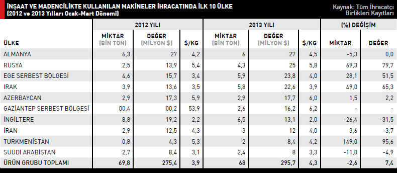 2013 yılının Ocak-Mart döneminde inşaat ve madencilikte kullanılan makineler, aksam ve parçaları ürün grubunda en fazla ihracat gerçekleştirilen ülke 27 milyon dolarla Almanya oldu. Almanya’dan sonra ikinci sırada yer alan Rusya’ya 2012 yılının Ocak-Mart döneminde 13,9 milyon dolarlık ihracat gerçekleştirilirken bu rakam yüzde 79,7 artışla 2013 yılının aynı döneminde 25 milyon dolar seviyesine yükseldi. Listenin üçüncü sırasında bulunan Ege Serbest Bölgesi’ne 2013 yılının Ocak-Mart döneminde bir önceki yıla oranla yüzde 51,5 artışla, 23,8 milyon dolarlık ürün gönderildi. 2012 yılının aynı döneminde Ege Serbest Bölgesi’ne gerçekleştirilen ihracatın değeri 15,7 milyon dolardı. Listenin dördüncü sırasında yer alan Irak’a 2013 yılının Ocak-Mart döneminde 22,6 milyon dolar değerinde ihracat gerçekleştirildi. Yüzde 65,3 artışın yaşandığı Irak’a 2012 yılının aynı döneminde gönderilen ürünlerin değeri 13,6 milyon dolar seviyesindeydi.