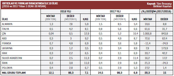 2017 yılının Ocak-Nisan döneminde Türkiye geneli ısıtıcılar ve fırınlar mal grubunda en fazla ihracat artışı yüzde 843,8 ile Çin’de yaşandı. Bu ülkenin ardından yüzde 173,9 ile Ukrayna gelirken yüzde 62,4 ile ABD üçüncü sırada yer aldı.