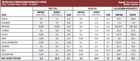 2018 yılının 1-31 Ocak döneminde ısıtıcılar ve fırınlar mal grubunda en fazla ihracat artışı yüzde 145.459,5 ile Meksika’da yaşandı. Bu ülkenin ardından yüzde 140,4 ile Rusya gelirken yüzde 138,5 ile İtalya üçüncü sırada yer aldı.