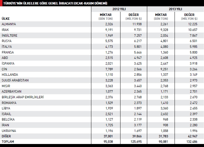 Isıtıcılar ve fırınlar ihracatı 2013 yılının Ocak-Kasım döneminde bir önceki yılın aynı dönemine göre yüzde 4,3 artış gösterdi. 2012 yılının Ocak-Kasım döneminde 267,7 milyon dolarlık ihracat gerçekleştiren sektörün, 2013 yılının aynı dönemindeki ihracatı 279,4 milyon dolar olarak kaydedildi. Isıtıcılar ve fırınlar ürün grubunda 2013 yılının Ocak-Kasım döneminde 28,3 milyon dolarla en fazla ihracat Almanya’ya gerçekleştirildi. Yüzde 5,7 artışın yaşandığı söz konusu ülkeye 2012 yılının aynı döneminde gönderilen ürünlerin değeri 26,8 dolardı. Listenin ikinci sırasında ise Rusya bulunuyor. Rusya’ya 2013 yılının Ocak-Kasım döneminde ihraç edilen ürünlerin değeri 20,7 milyon dolar olarak kaydedildi. Üçüncü sıradaki Azerbaycan’a 2013 yılının Ocak-Kasım döneminde ihraç edilen ürünlerin değeri 18 milyon dolar olarak kaydedildi. Yüzde 93,9 ihracat artışının yaşandığı söz konusu ülkeye, 2012 yılının aynı döneminde gönderilen ürünlerin değeri 9,2 milyon dolar seviyesindeydi. Listenin dördüncü ve beşinci sırasında ise Irak ve Fransa bulunuyor. Dördüncü sıradaki Irak’a 2012 yılı Ocak-Kasım döneminde gönderilen ürünlerin değeri 15 milyon dolarken bu rakam, yüzde 7,6 artışla 2013 yılının aynı döneminde 17,5 milyon dolar seviyesine yükseldi. Beşinci sıradaki Fransa’ya ise 2013 yılı Ocak- Kasım döneminde 15,1 milyon dolarlık ısıtıcılar ve fırınlar ihracatı gerçekleştirildi. Yüzde 0,9 ihracat artışı yaşanan sektörün 2012 yılının aynı dönemindeki ihracatı 15 milyon dolardı. Isıtıcılar ve fırınlar mal grubunda en fazla ihracat artışı yüzde 120,7 ile Suudi Arabistan’da yaşandı. Suudi Arabistan’ın ardından yüzde 93,9 ile