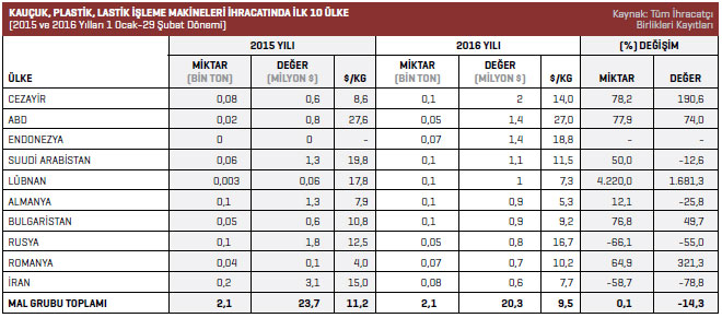 2016 yılının Ocak-Şubat döneminde Türkiye geneli kauçuk, plastik, lastik işleme makineleri aksam ve parçaları sektöründe ihracat artışının en fazla yaşandığı ülke yüzde 1.681,3 ile Lübnan oldu. Listenin ikinci sırasında yüzde 321,3 Romanya yer alırken söz konusu ülkeyi yüzde 190,6 ihracat artışıyla Cezayir üçüncü sırada izledi.