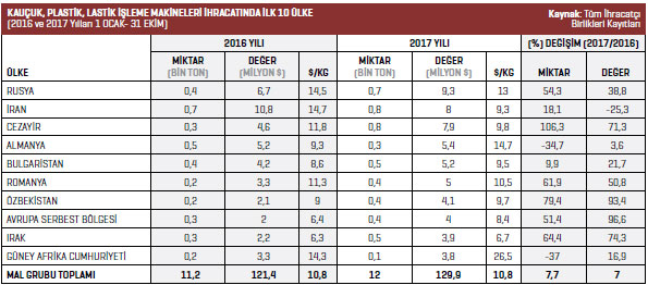 plastik, lastik işleme makineleri ihracatı 2016 yılının Ocak-Ekim döneminde 121,4 milyon dolarken 2017 yılının aynı döneminde bu rakam yüzde 7 artışla 129,9 milyon dolar oldu.