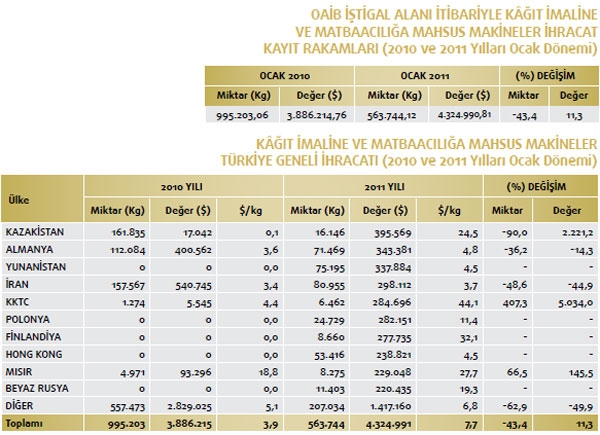 Makine ve aksamları ihracatımızın en önemli kalemlerinden biri olan kâğıt imaline ve matbaacılığa mahsus makineler ihracatımız 2011 yılının Ocak döneminde artış kaydetti. Geçtiğimiz yılın Ocak dönemi ile karşılaştırıldığında değer bazında yüzde 11,3 yükseldi. Değer olarak ise 2010 yılının Ocak döneminde 3 milyon 886 bin dolar olan kâğıt imaline ve matbaacılığa mahsus makineler ihracatımız, 2011 yılının Ocak döneminde ise yüzde 11,3 oranında artarak 4 milyon 324 bin dolar oldu. Kâğıt imaline ve matbaacılığa mahsus makineler ihracatımızın en fazla olduğu yer ise Kazakistan. Söz konusu yere 2011 yılının Ocak döneminde 395 bin dolarlık kâğıt imaline ve matbaacılığa mahsus makineler ihracatı gerçekleştirildi. Bu mal grubu içerisindeki en büyük ikinci ihracat pazarımızın ise Almanya olduğu görülüyor. Almanya’ya 2010 yılının Ocak döneminde 400 bin dolarlık kâğıt imaline ve matbaacılığa mahsus makineler ihracatımız söz konusu iken 2011 yılının aynı dönemine gelindiğinde 343 bin dolar ihracat düzeyi yakalandı. Kâğıt imaline ve matbaacılığa mahsus makineler ihracatımızın üçüncü en büyük pazarı ise Yunanistan oldu. Yunanistan’a 2010 yılında kâğıt imaline ve matbaacılığa mahsus makineler ihracatımız söz konusu değil iken 2011 yılının aynı dönemine gelindiğinde 337 bin dolarlık ihracat gerçekleştirdik. Kâğıt imaline ve matbaacılığa mahsus makineler ihracatımızda dördüncü sırada İran yer alıyor. İran’a 2010 yılının Ocak döneminde 540 bin dolarlık kâğıt imaline ve matbaacılığa mahsus makineler ihracatımız söz konusu iken 2011 yılının aynı dönemine gelindiğinde 298 bin dolar ihracat gerçekleşti. Kâğıt imaline ve matbaacılığa mahsus makineler ihracatımızın 2011 yılı Ocak döneminde en fazla artış gösterdiği ilk beşte yer alan beşinci ülkenin ise KKTC olduğu açıklandı. KKTC’ye 2010 yılının Ocak döneminde 5 bin dolarlık ihracatımız söz konusu iken 2011 yılının aynı dönemine gelindiğinde ise 284 bin dolar ihracat gerçekleşti. Kâğıt imaline ve matbaacılığa mahsus makineler ihracatımızda değer bakımdan ise ilk üç sırada yüzde 5.034,0 değer artışı ile yine KKTC yer alıyor. Söz konusu ülkeden sonra yüzde 2.221,2 ile Kazakistan ve sonrasında yüzde 145,5 oranında yükselişle Mısır takip ediyor.
