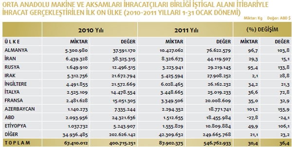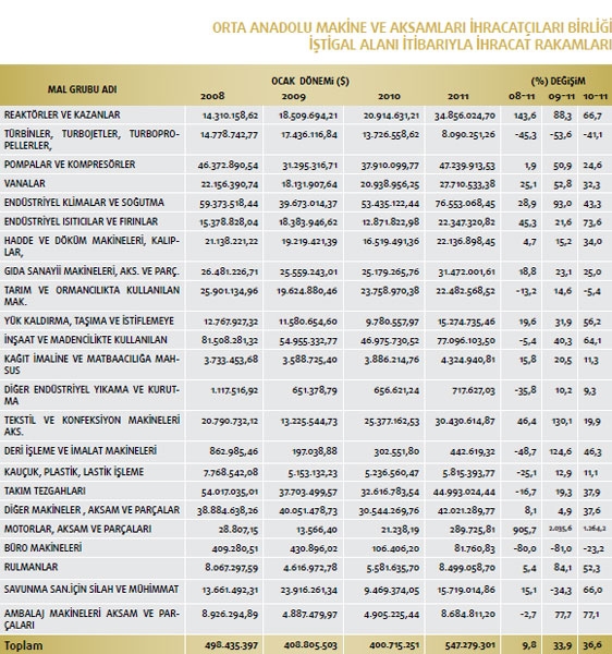Makine ve Aksamları İhracatçıları Birliği iştigal alanına giren GTİP’ler kapsamında belirlenen Türkiye geneli ihracat kayıtlarına göre ise; 2010 yılı Ocak döneminde ihracat kayıt rakamı 400 milyon 715 bin dolarken, bu rakam 2011 yılı aynı döneminde yüzde 36,4 oranında artarak 546 milyon 762 bin dolara yükseldi. Makine sektörü toplamı 84’üncü faslın tamamı ve 84’üncü fasıl dışı makine ve aksamları ihracatçıları birliği iştigal alanı toplamından oluşan makine sektörünün tamamının ihracatı 2010 yılı ocak döneminde 647 milyon 908 bin dolar iken, bu rakam 2011 yılı aynı döneminde yüzde 24,7 oranında artarak 807 milyon 792 bin dolara yükseldi. Mal grupları bazında incelendiğinde ise 2011 yılı Ocak dönemi ihracatında en fazla artışın motorlar aksam ve parçalarında yaşandığı ortaya çıktı. Yüksek artış gösteren kalemlerin ilki yüzde 1264,2 ile motorlar aksam ve parçaları, ikincisi yüzde 77,1 ile ambalaj makineleri ksam ve parçaları ve üçüncüsü yüzde 73,6 ile endüstriyel ısıtıcılar ve fırınlar oldu. Daha sonra sırasıyla yüzde 66,7 ile reaktörler ve kazanlar ile yüzde 66 ile savunma sanayi için silah ve mühimmat olarak gerçekleşti. OAİB iştigal alanına giren ürünler itibariyle, mal gruplarının sektör ihracatından aldıkları paylar incelendiğinde; 2011 yılı Ocak döneminde yüzde 14 pay ile endüstriyel klimalar ve soğutma makineleri birinci, yüzde 14 pay ile inşaat ve madencilikte kullanılan makineler ikinci ve yüzde 8,6 pay ile pompa ve kompresörler üçüncü sırada yer aldı.