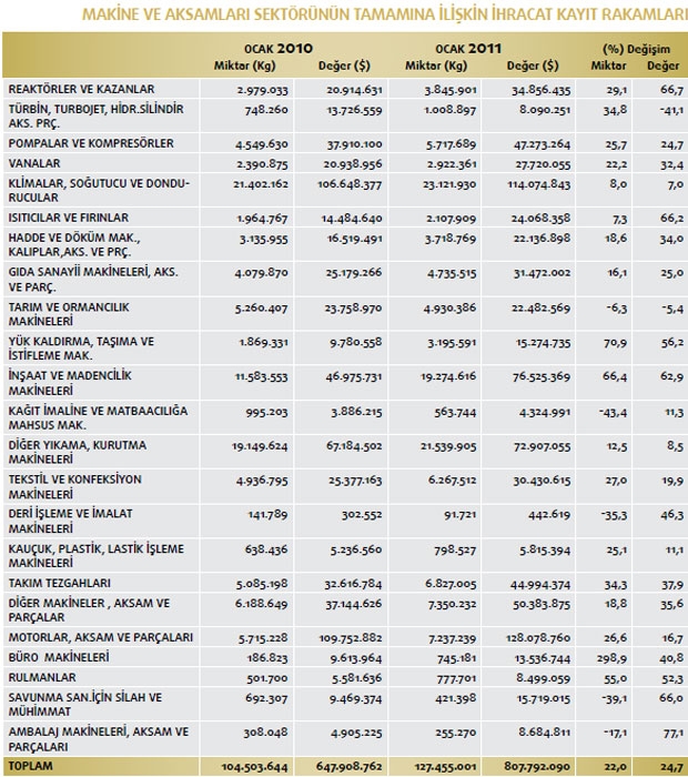 Makine sektörü toplamı 84’üncü faslın tamamı ve 84’üncü fasıl dışı makine ve aksamları ihracatçıları birliği iştigal alanı toplamından oluşan makine sektörünün tamamının ihracatı 2010 yılı ocak döneminde 647 milyon 908 in dolar iken, bu rakam 2011 yılı aynı döneminde yüzde 24,7 oranında artarak 807 milyon 792 bin dolara yükseldi.