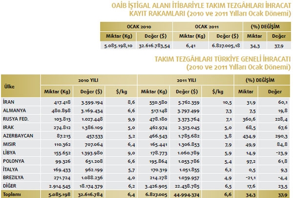 Takım tezgâhları ihracatımızın en fazla olduğu yer ise İran. Söz konusu yere 2011 yılının Ocak döneminde 5 milyon 762 bin dolarlık takım tezgâhları ihracatı gerçekleştirildi. Bu mal grubu içerisindeki en büyük ikinci ihracat pazarımızın ise Almanya olduğu görülüyor. Almanya’ya 2010 yılının Ocak döneminde 3 milyon 169 bin dolarlık takım tezgâhları ihracatımız söz konusu iken 2011 yılının aynı dönemine gelindiğinde 3 milyon 797 bin dolar ihracat düzeyi yakalandı. Takım tezgâhları ihracatımızın üçüncü en büyük pazarı ise Rusya Federasyonu oldu. Rusya Federasyonu’na 2010 yılının Ocak döneminde 1 milyon 27 bin dolarlık takım tezgâhları ihracatımız söz konusu iken 2011 yılının aynı dönemine gelindiğinde 3 milyon 373 bin dolara yükseldi. Takım tezgâhları ihracatımızda dördüncü sırada Irak yer alıyor. Irak’a 2010 yılının Ocak döneminde 1 milyon 368 bin dolarlık takım tezgâhları ihracatımız söz konusu iken 2011 yılının aynı dönemine gelindiğinde 2 milyon 323 bin dolar ihracat gerçekleşti. Takım tezgâhları ihracatımızın 2011 yılı Ocak döneminde en fazla artış gösterdiği ilk beşte yer alan beşinci ülkenin ise Azerbaycan olduğu açıklandı. Azerbaycan’a 2010 yılının Ocak döneminde 457 bin dolarlık ihracatımız söz konusu iken 2011 yılının aynı dönemine gelindiğinde ise 1 milyon 785 bin dolar ihracat gerçekleşti. Takım tezgâhları ihracatımızda değer bakımdan ise ilk üç sırada yüzde 290,3 değer artışı ile yine Azerbaycan yer alıyor. Söz konusu ülkeden sonra yüzde 228,4 ile Rusya Federasyonu ve sonrasında yüzde 84,8 oranında yükselişle Mısır takip ediyor.