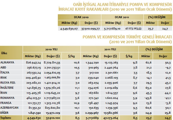 Makine ve aksamları ihracatımızın en önemli kalemlerinden biri olan pompa ve kompresör ihracatımız 2011 yılının Ocak döneminde artış kaydetti. Geçtiğimiz yılın Ocak dönemi ile karşılaştırıldığında değer bazında yüzde 24,7 yükseldi. Değer olarak ise 2010 yılının Ocak döneminde 37 milyon 910 bin dolar olan pompa ve kompresör ihracatımız, 2011 yılının Ocak döneminde ise yüzde 24,7 oranında artarak 47 milyon 273 bin dolar oldu. Pompa ve kompresör ihracatımızın en fazla olduğu yer ise Almanya. Söz konusu yere 2011 yılının Ocak döneminde 13 milyon 123 bin dolarlık pompa ve kompresör ihracatı gerçekleştirildi. Bu mal grubu içerisindeki en büyük ikinci hracat pazarımızın ise ABD olduğu görülüyor. ABD’ye 2010 yılının Ocak döneminde 2 milyon 701 bin dolarlık pompa ve kompresör ihracatımız söz konusu iken 2011 yılının aynı dönemine gelindiğinde 2 milyon 440 bin dolar ihracat düzeyi yakalandı. Pompa ve kompresör ihracatımızın üçüncü en büyük pazarı ise İtalya oldu. İtalya’ya 2010 yılının Ocak döneminde 2 milyon 54 bin dolarlık pompa ve kompresör ihracatımız söz konusu iken 2011 yılının aynı dönemine gelindiğinde 2 milyon 301 bin dolara yükseldi. Pompa ve kompresör ihracatımızda dördüncü sırada Irak yer alıyor. Irak’a 2010 yılının Ocak döneminde 1 milyon 463 bin dolarlık pompa ve kompresör ihracatımız söz konusu iken 2011 yılının aynı dönemine gelindiğinde 2 milyon 68 bin dolar ihracat gerçekleşti. Pompa ve kompresör ihracatımızın 2011 yılı Ocak döneminde en fazla artış gösterdiği ilk beşte yer alan beşinci ülkenin ise Rusya Federasyonu olduğu açıklandı. Rusya Federasyonu’na 2010 yılının Ocak döneminde 1 milyon 421 bin dolarlık ihracatımız söz konusu iken 2011 yılının aynı dönemine gelindiğinde ise 2 milyon 35 bin dolar ihracat gerçekleşti. Pompa ve kompresör ihracatımızda değer bakımdan ise