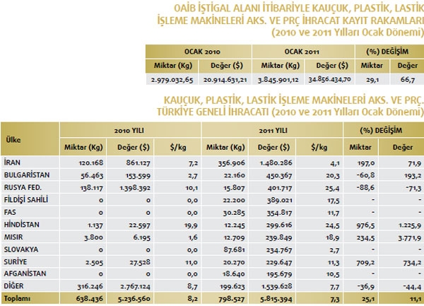 Makine ve aksamları ihracatımızın en önemli kalemlerinden biri olan kauçuk, plastik, lastik işleme makineleri aksamları e parçaları ihracatımız 2011 yılının Ocak döneminde artış kaydetti. Geçtiğimiz yılın Ocak dönemi ile karşılaştırıldığında değer bazında yüzde 66,7 yükseldi. Değer olarak ise 2010 yılının Ocak döneminde 20 milyon 914 bin dolar olan kauçuk, plastik, lastik işleme makineleri aksamları ve parçaları ihracatımız, 2011 yılının Ocak döneminde ise yüzde 66,7 oranında artarak 34 milyon 856 bin dolar oldu. Kauçuk, plastik, lastik işleme makineleri aksamları ve parçaları ihracatımızın en fazla olduğu yer ise İran. Söz konusu yere 2011 yılının Ocak döneminde 1 milyon 480 bin dolarlık kauçuk, plastik, lastik işleme makineleri aksamları ve parçaları ihracatı gerçekleştirildi. Bu mal grubu içerisindeki en büyük ikinci ihracat pazarımızın ise Bulgaristan olduğu görülüyor. Bulgaristan’a 2010 yılının Ocak döneminde 153 bin dolarlık kauçuk, plastik, lastik işleme makineleri aksamları ve parçaları ihracatımız söz konusu iken 2011 yılının aynı dönemine gelindiğinde 450 bin dolar ihracat düzeyi yakalandı. Kauçuk, plastik, lastik işleme makineleri aksamları ve parçaları ihracatımızın üçüncü en büyük pazarı ise Rusya Federasyonu oldu. Rusya Federasyonu’na 2010 yılının Ocak döneminde 1 milyon 398 bin dolarlık kauçuk, plastik, lastik işleme makineleri aksamları ve parçaları ihracatımız söz konusu iken 2011 yılının aynı dönemine gelindiğinde 401 bin dolara gerilediği görüldü. Kauçuk, plastik, lastik işleme makineleri aksamları ve parçaları ihracatımızda dördüncü sırada Fildişi Sahili yer alıyor. Fildişi Sahili’ne 2010 yılında hiç ihracat gerçekleştirmezken 2011 yılında 389 bin dolar ihracat gerçekleşti. Kauçuk, plastik, lastik işleme makineleri aksamları ve parçaları ihracatımızın 2011 yılı Ocak döneminde en fazla artış gösterdiği ilk beşte yer alan beşinci ülkenin ise Fas olduğu açıklandı. Fas’a da aynı şekilde 2010 yılında hiç ihracat yapmazken 2011 yılında 354 bin dolar ihracat gerçekleşti. Kauçuk, plastik, lastik işleme makineleri aksamları ve parçaları ihracatımızda değer bakımdan ise ilk üç sırada yüzde 3.771,9 değer artışı ile Mısır yer alıyor. Söz konusu ülkeden sonra yüzde 1.225,9 ile Hindistan ve sonrasında yüzde 193,2 oranında yükselişle Bulgaristan takip ediyor.