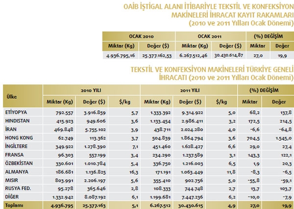 Makine ve aksamları ihracatımızın en önemli kalemlerinden biri olan tekstil ve konfeksiyon makineleri ihracatımız 2011 yılının Ocak döneminde artış kaydetti. Geçtiğimiz yılın Ocak dönemi ile karşılaştırıldığında değer bazında yüzde 19,9 yükseldi. Değer olarak ise 2010 yılının Ocak döneminde 25 milyon 377 bin dolar olan tekstil ve konfeksiyon makineleri ihracatımız, 2011 yılının Ocak döneminde ise yüzde 19,9 oranında artarak 30 milyon 430 bin dolar oldu. Tekstil ve konfeksiyon makineleri ihracatımızın en fazla olduğu yer ise Etiyopya. Söz konusu yere 2011 yılının Ocak döneminde 9 milyon 314 bin dolarlık tekstil ve konfeksiyon makineleri ihracatı gerçekleştirildi. Bu mal grbu içerisindeki en büyük ikinci ihracat pazarımızın ise Hindistan olduğu görülüyor. Hindistan’a 2010 yılının Ocak döneminde 949 bin dolarlık tekstil ve konfeksiyon makineleri ihracatımız söz konusu iken 2011 yılının aynı dönemine gelindiğinde 2 milyon 986 bin dolar ihracat düzeyi yakalandı. Tekstil ve konfeksiyon makineleri ihracatımızın üçüncü en büyük pazarı ise İran oldu. İran’a 2010 yılının Ocak döneminde 5 milyon 755 bin dolarlık tekstil ve konfeksiyon makineleri ihracatımız söz konusu iken 2011 yılının aynı dönemine gelindiğinde 2 milyon 24 bin dolara gerilediği görüldü. Tekstil ve konfeksiyon makineleri ihracatımızda dördüncü sırada Hong Kong yer alıyor. Hong Kong’a 2010 yılının Ocak döneminde 113 bin dolarlık tekstil ve konfeksiyon makineleri ihracatımız söz konusu iken 2011 yılının aynı dönemine gelindiğinde 1 milyon 864 bin dolar ihracat gerçekleşti. Tekstil ve konfeksiyon makineleri ihracatımızın 2011 yılı Ocak döneminde en fazla artış gösterdiği ilk beşte yer alan beşinci ülkenin ise İngiltere olduğu açıklandı. İngiltere’ye 2010 yılının Ocak döneminde 1 milyon 278 bin dolarlık ihracatımız söz konusu iken 2011 yılının aynı dönemine gelindiğinde ise 1 milyon 628 bin dolar ihracat gerçekleşti. Tekstil ve konfeksiyon makineleri ihracatımızda değer bakımdan ise ilk üç sırada yüzde 1.545,0 değer artışı ile Hong Kong yer alıyor. Söz konusu ülkeden sonra yüzde 214,5 ile Hindistan ve sonrasında yüzde 137,8 oranında yükselişle Etiyopya takip ediyor.