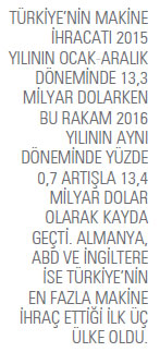 2016 yılının Ocak-Aralık döneminde Türkiye’nin makine ihracatı 13,4 milyar dolara yükseldi. Türkiye’nin en fazla ihracat gerçekleştirdiği ilk 20 ülke listesinde 2016 yılı Ocak- Aralık dönemi itibarıyla