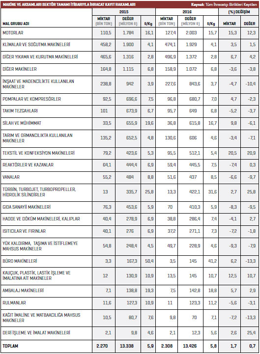 Makine sektöründe 2016 yılı Ocak- Aralık döneminde en fazla ihracat gerçekleştiren alt sektör motorlar oldu. 2015 yılının Ocak-Aralık döneminde söz konusu ürün grubunda gerçekleştirilen ihracat 1,7 milyar dolarken 2016 yılının aynı döneminde bu rakam yüzde 12,3 artışla 2 milyar dolar seviyesinde kaydedildi. Listenin ikinci sırasında bulunan klimalar ve soğutma makineleri kaleminde 2016 yılının Ocak-Aralık dönemindeki ihracat, bir önceki yılın aynı dönemine göre yüzde 1,5 artarak 1,9 milyar dolar seviyesine yükseldi. 2016 yılının Ocak-Aralık dönemi itibarıyla makine sektöründe en fazla ihracat gerçekleştiren üçüncü kalem ise 1,3 milyar dolarlık ihracat değeriyle diğer yıkama ve kurutma makineleri oldu. Diğer yıkama ve kurutma makineleri ürün grubundaki ihracat artışı bir önceki yılın aynı dönemine göre yüzde 4,2 olarak kaydedildi.