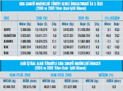 Türkiye gıda sanayii makineleri ihracatı 2009 yılının Ocak-Eylül döneminde azalış gösterdi. 2008 yılının Ocak-Eylül döneminde 292 milyon 15 bin dolarlık gıda sanayii makineleri ihracatısöz konusu iken 2009 yılının Ocak-Eylül dönemine gelindiğinde ise yüzde 6,9 oranında gerileyerek 271 milyon 827 bin dolar seviyesi düşmüş. Gıda sanayi makineleri ihracatımız ülkeler bazında incelendiğinde ise bu mal grubu için en fazla ihracat gerçekleştirdiğimiz ülkenin Suriye olduğu görülüyor. Suriye’ye 2008 yılının Ocak-Eylül döneminde Türkiye’den 13 milyon 116 bin dolarlık gıda sanayii makineleri ihracatı gerçekleştirilmişken 2009 yılının Ocak-Eylül döneminde ise yüzde 63,3 oranında artışla 21 milyon 420 bin dolar seviyesine ulaşılmış. Gıda sanayii makinelerindeki en büyük ikinci pazarımız ise Kazakistan.