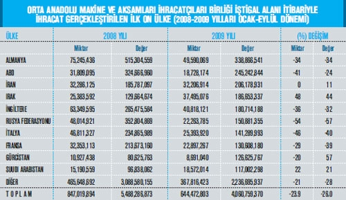 Orta Anadolu Makine ve Aksamları İhracatçıları Birliği iştigal alanına giren GTİP’ler kapsamı nda belirlenen Türkiye geneli ihracat kayıtlarına göre; 2008 yılı Ocak-Eylül dönemi ihracat kayıt rakamı 5 milyar 488 milyon dolar iken, bu rakam 2009 yılının eş zaman diliminde yüzde 26 oranında azalarak 4 milyar 60 milyon dolar olarak gerçekleşti. Makine sektörü toplamı, 84. faslın tamamı ve 84. fasıl dışı Orta Anadolu Makine ve Aksamları İhracatçıları Birliği iştigal alanı itibariyle 2009 yılının ilk 10 ayında önceki yılın aynı dönemine kıyasla yüzde 25,7 azalarak 6 milyar 342 milyon dolar olarak kaydedildi.