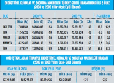Ülkemiz Ocak-Eylül 2009 dönemi Orta Anadolu Makine ve Aksamları İhracatçıları Birliği iştigal alanı itibariyle ihracat kayıt rakamları incelendiğinde endüstriyel klimalar ve soğutma makineleri ihracatımızın geçen yılın aynı dönemine göre yüzde 22.7 oranında değer kaybı yaşayarak 683 milyon 273 bin dolardan 528 milyon 265 bin dolara düştüğü görülüyor.