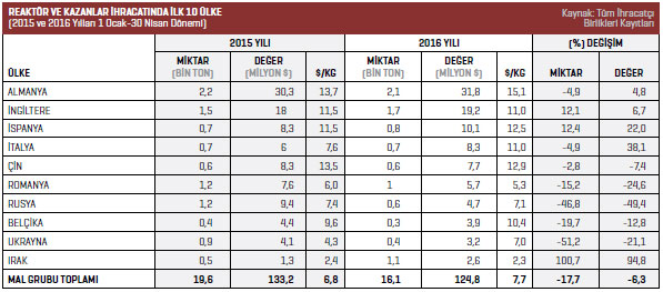 2016 yılının Ocak-Nisan döneminde Türkiye geneli reaktör ve kazanlar sektöründe en fazla ihracat artışı yüzde 94,8 ile Irak’ta yaşandı. Bu ülkenin ardından yüzde 38,1 ile İtalya ikinci sırada gelirken yüzde 22 ile İspanya üçüncü sırada yer aldı.