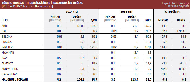 2015 yılının Ocak-Nisan döneminde Türkiye geneli türbin, turbojet, hidrolik silindir aksam ve parçaları sektöründe en fazla ihracat artışı yüzde 1.948,8 ile Birleşik Arap Emirlikleri’nde gerçekleşti. Listede Arnavutluk yüzde 890,4 ile ikinci, İngiltere ise yüzde 56,7 ile üçüncü sırada yer aldı.
