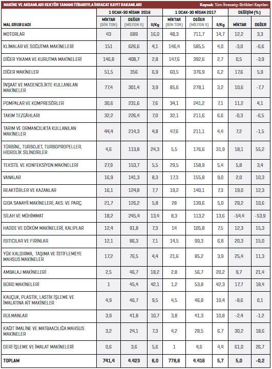 Makine sektöründe 2017 yılı Ocak- Nisan döneminde en fazla ihracat gerçekleştiren alt sektör motorlar oldu. 2016 yılının Ocak-Nisan döneminde söz konusu ürün grubunda gerçekleştirilen ihracat 689 milyon dolarken 2017 yılının aynı döneminde bu rakam yüzde 3,3 artışla 711,7 milyon dolar seviyesinde kaydedildi. Listenin ikinci sırasında bulunan klimalar ve soğutma makineleri kaleminde 2017 yılının Ocak-Nisan döneminde gerçekleştirilen ihracat 585,5 milyon dolar oldu. 2017 yılı Ocak-Nisan dönemi itibarıyla makine sektöründe en fazla ihracat gerçekleştiren üçüncü kalem ise 392,6 milyon dolarlık ihracat değeriyle diğer yıkama ve kurutma makineleri olarak kaydedildi.