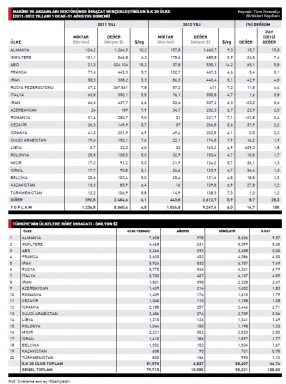 Makine ve aksamları ihracatı 2012 yılı Ocak-Ağustos döneminde yüzde14,7 artarak 9,2 milyar dolar düzeyine ulaştı. Türkiye’nin makine ihracatında ilk 10 ülke sıralamasında ise Almanya 1,4 milyar dolar değeriyle ilk sırada bulunuyor.