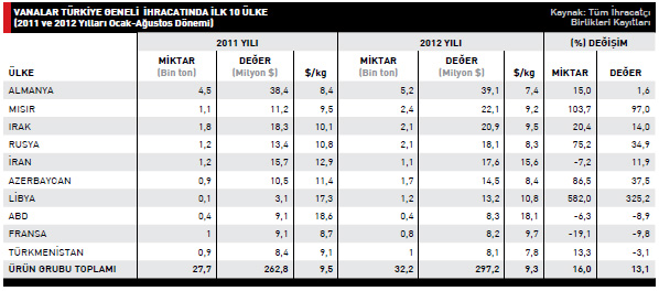 Vanalar sektöründe 2012 yılı Ocak-Ağustos döneminde en fazla ürün ihraçedilen ülke 39,1 milyon dolarla Almanyaoldu. Yüzde 1,6 artışın yaşandığıAlmanya’ya 2011 yılının aynı döneminde38,4 milyon dolarlık ürün ihraç edildi.İkinci sırada yer alan Mısır’a yönelik ihracatımız yüzde 97 artışla 2012 yılı Ocak-Ağustos döneminde 22,1 milyon dolar oldu.