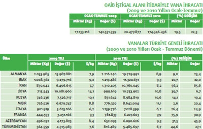 Türkiye vana ihracatı geçtiğimiz yılın Ocak-Temmuz dönemine göre 2010 yılının aynı zaman dilimi ile kıyaslandığında yüzde 22,3 oranında yükseliş göstermiş durumda. 2009 yılının ilk 7 ayında 142 milyon 531 bin dolar olan vana ihracatımız 2010 yılının ilk 7 ayında ise 174 milyon 346 bin dolar olmuş.Vana ihracatımız ülkeler bazında incelendiğinde ise Almanya’nın en fazla ihracat gerçekleştirdiğimiz ülke olduğu görülüyor. Söz konusu ülkeye 2009 yılının Ocak-Temmuz döneminde 15 milyon 987 bin dolarlık ihracat gerçekleştirilirken, 2010 yılının aynı döneminde yüzde 23,4’lük değer artışı ile 19 milyon 729 bin dolarlık vana ihracatı yapılmış. Almanya’nın ardından en fazla takım tezgâhları ihracatımız olan ikinci ülke ise Irak. Bu ülkeye geçtiğimiz yılın ilk yedi aylık döneminde 9 milyon 279 bin dolarlık vana ihracatı söz konusu iken 2010 yılının aynı dönemine gelindiğinde yüzde 22 oranında artış ile 11 milyon 320 bin dolarlık ihracat yapılmış. İran ise vana ihracatımızın en fazla olduğu üçüncü pazar konumunda. İran’a geçtiğimiz yılın ilk 7 aylık döneminde 6 milyon 496 bin dolarlık vana ihracatı gerçekleştirilmişken 2010 yılının aynı dönemine gelindiğinde ise yüzde 65,6 oranında değer artışı ile 10 milyon 760 bin dolarlık ihracat kaydedilmiş. Vana ihracatında en fazla değer artışı ise yüzde 90,9 ile Fransa ile olan ihracatta yaşanmıştır. Söz konusu ülkeye 2009 yılının Ocak-Temmuz döneminde 3 milyon 251 bin dolarlık ihracat gerçekleştirilirken, 2010 yılının aynı döneminde bu rakam 6 milyar 207 milyon dolara çıkmıştır. Vana ihracatında diğer önemli değer artışı ise Azerbaycan’da yaşanmıştır.Söz konusu ülkeye 2009 yılının Ocak-Temmuz döneminde 4 milyon 173 bin dolarlık ihracat gerçekleştirilirken, 2010 yılının aynı döneminde bu rakam yüzde 45,9 artış göstererek 6 milyar 90 milyon dolara çıkmıştır.