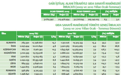 Türkiye gıda sanayi makineleri ihracatı geçtiğimiz yılın Ocak-Temmuz dönemine göre 2010 yılının aynı zaman dilimi ile kıyaslandığında yüzde 3,9 oranında gerileme göstermiş durumda. 2009 yılının ilk 7 ayında 213 milyon 476 bin dolar olan gıda sanayii makineleri ihracatımız 2010 yılının ilk 7 ayında ise 205 milyon 242 bin dolar olmuş.Gıda sanayi makineleri ihracatımız ülkeler bazında incelendiğinde ise Almanya’nın en fazla ihracat gerçekleştirdiğimiz ülke olduğu görülüyor. Söz konusu ülkeye 2010 yılının Ocak-Temmuz ayları arasında 19 milyon 303 bin dolarlık gıda sanayi makineleri ihracatı yapılmış.Almanya’nın ardından en fazla gıda sanayi makineleri ihracatımız olan ikinci ülke ise İran.Bu ülkeye geçtiğimiz yılın ilk yedi aylık döneminde 10 milyon 11 bin dolarlık gıda sanayi makineleri ihracatı söz konusu iken 2010 yılının aynı dönemine gelindiğinde yüzde 68,8 oranında değer artışı yakalanarak 16 milyon 903 bin dolarlık ihracat yapılmış. Azerbaycan ise gıda sanayi makineleri ihracatımızın en fazla olduğu üçüncü pazar konumunda. Azerbaycan’a geçtiğimiz yılın ilk 7 aylık döneminde 6 milyon 961 bin dolarlık gıda sanayi makineleri ihracatı gerçekleştirilmişken 2010 yılının aynı dönemine gelindiğinde ise yüzde 109,2 oranında değer artışı ile 14 milyon 565 bin dolarlık ihracat kaydedilmiş.Genç DeğirmenMustafa Budak – Yönetim Kurulu Başkanı “İHRACATIMIZ ARTTI” Geçtiğimiz yıllara kıyasla bu sene Temmuz ayında çok daha iyi ihracat rakamlarına ulaştığımızı söyleyebilirim. Özellikle Ramazan ayının gelmesi dolayısıyla işlerimizin çoğunu Ramazan öncesine almaya çalıştık. Bu nedenle de Haziran ve Temmuz ayı içinde satışlarımız çok iyi geçti. Genel olarak sektöre baktığımızda ise gitgide pazarın daraldığını, müşteri potansiyelinin azaldığını söyleyebilirim. Şu anda en fazla ihracatı Türkî Cumhuriyetlere gerçekleştiriyoruz.Değirmencilik sektöründe tek tek üretim yapmıyoruz ve yüksek maliyetli yatırımlar üretiyoruz. Genel olarak gıda sanayi makinelerine baktığımızda ise 2010 Ocak-Temmuz döneminde sektör 205 milyon 242 bin dolar seviyesinde ihracat gerçekleştirdi. Bu rakam geçtiğimiz yılın aynı döneminde 213 milyon 476 bin dolar civarındaydı. Bu da genel olarak sektörde yüzde 3,9’luk bir düşüş olduğunu gösteriyor.