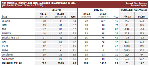 Yük kaldırma, taşıma ve istifleme makineleri ihracatı 2017 yılının Ocak-Ağustos döneminde 180,8 milyon dolar olarak kayda geçti. 2016 yılının aynı döneminde bu rakam 158,3 milyon dolardı. Söz konusu ürün grubundaki ihracat artışı yüzde 14,2 olarak kaydedildi.