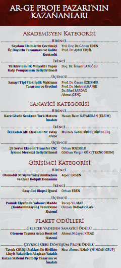 I. Makine ve Aksamları İmalat Teknolojileri Ar-Ge Proje Pazarı etkinliği çerçevesinde gerçekleşti. Proje yarışma sonuçları 13 Nisan günü Haliç Kongre Merkezi’nde düzenlenen törenle açıklandı. Akademisyen, sanayici ve girişimci kategorisinde dokuz proje ödüle layık görüldü.