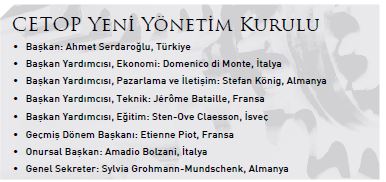 CETOP (Avrupa Hidrolik ve Pnomatik Komitesi) Yönetim Kurulu Başkanlığı’nı üç yıl süreyle Ahmet Serdaroğlu yürütecek.Hidrolik ve Pnömatik sektörünün Avrupa komitesi olan CETOP, 1962 yılında İsveç’in Stockholm şehrinde kuruldu. Komite, Türkiye’nin de içinde bulunduğu 17 Avrupa ülkesindeki hidrolik ve pnömatik sektörünün şemsiye organizasyonu olarak görev yapıyor. İmalatçı ve satıcı olarak binin üzerinde firmayı temsil eden CETOP, Avrupa hidrolik ve pnömatik sektörünün yüzde 85’ini kapsıyor. Üye ülkelerin dernek başkanlarından oluşan CETOP Genel Kurulu için yılda bir kez toplanan genel kurul üyeleri, sektörel gelişmelerle ilgili bilgi alışverişinde bulunuyor ve geleceğe yönelik çeşitli kararlar alıyor. CETOP’un 2009 yılındaki genel kurul toplantısı AKDER’in ev sahipliğinde İstanbul’da gerçekleştirilmişti. Yedi kişilik yönetim kurulu tarafından idare edilen CETOP, genel kurul yanında ayrıca yönetim kurulu ve yönetim kuruluna bağlı komisyonlardan meydana geliyor. Başkan, başkanın selefi ve üyelerden oluşan CETOP Yönetim Kurulu’nda ise üyeler aynı zamanda komisyonlara da başkanlık ediyor.
