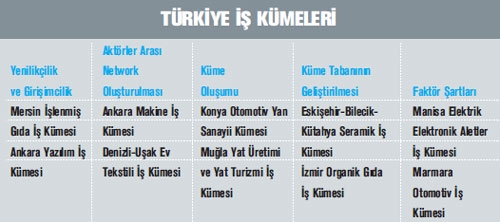 Bu noktada UKP kapsamında belirlenen kümelerin tespiti hakkında kısaca bilgi vermek yerinde olacaktır. Öncelikle küme kategorisi ampirik olarak bir arada faaliyet gösterdiği tespit edilen iktisadi faaliyet kolları olarak tanımlanarak, yürütülen istatistiksel çalışma sonucunda Türkiye için geçerli 32 küme kategorisi belirlenmiştir. Bu kategoriler projenin bitmesini müteakip hizmete geçecek olan Türkiye’nin kümelenme portalında yer almaktadır. Bu kategorilere kümelenmeye konu sektörler de diyebiliriz. Kategorilerin belirlenmesinden sonra tüm paydaşlarla koordinasyon ve işbirliğinin sağlanması na yönelik Küme Haritalandırma Çalışma Ekibi kurulmuştur. DTM koordinasyonunda; Sanayi ve Ticaret Bakanlığı, Tarım ve Köy İşleri Bakanlığı, Kültür ve Turizm Bakanlığı, Devlet Planlama Teşkilatı, Türkiye Odalar ve Borsalar Birliği (TOBB), TÜBİTAK, KOSGEB ve Türkiye İhracatçılar Meclisi’nin temsil edildiği Küme Haritalama Çalışma Ekibi küme seçim sürecinde aktif rol almıştır. Bu bağlamda, Küme Haritalandırma Çalışma Ekibi ile birlikte belirlenen 10 iş kümesi için yol haritaları hazırlanma çalı şmaları sona ermek üzeredir.