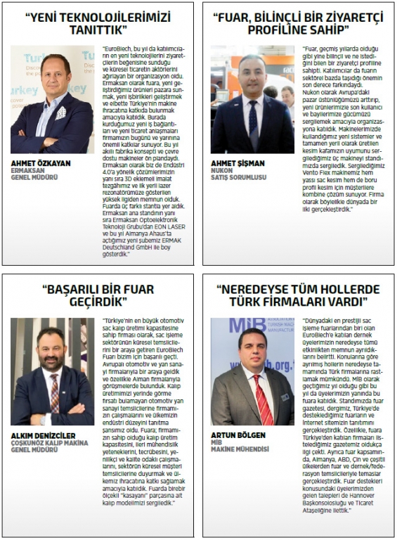 METAL VE SAC İŞLEME TEKNOLOJİLERİ SEKTÖRÜNDE DÜNYANIN EN BÜYÜK VE PRESTİJLİ FUARLARINDAN BİRİ OLAN EUROBLECH FUARI’NA KATILAN TÜRKİYE’NİN MAKİNECİLERİ, GERÇEKLEŞTİRDİĞİ REKLAM, TANITIM VE LOBİ FAALİYETLERİYLE TÜRK MAKİNE SEKTÖRÜNÜN İMAJININ GÜÇLENDİRİLMESİNE ÖNEMLİ BİR KATKIDA BULUNDU.