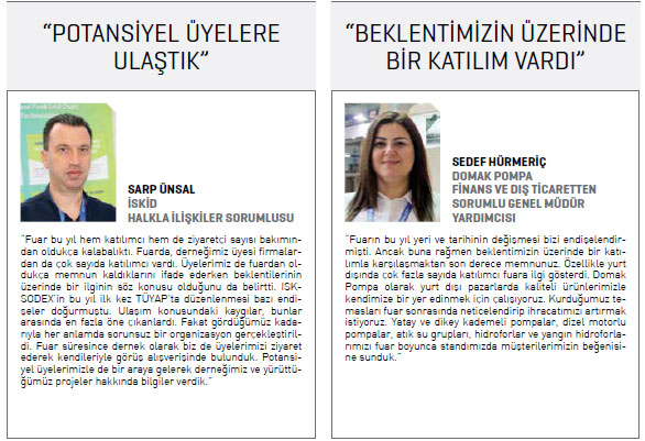 13 ve 14’üncü hollerde pompa ve vana firmalarının ürünlerini sergilediği 13. Uluslararası ISK-SODEX 2018 Fuarı’nı 93 ülkeden 84 bin 936 sektör profesyoneli ziyaret etti. Geçtiğimiz yıllarla karşılaştırıldığında uluslararası ziyaretçi oranı yüzde 14 artış kaydederken Ekonomi Bakanlığı ile iş birliği içinde; başta İran, Irak, Katar, Kuzey ve Batı Afrika, Rusya, Polonya, Almanya ve Avustralya olmak üzere çok sayıda ülken gelen 500’den fazla uluslararası satın almacı ikili iş görüşmeleri gerçekleştirdi. Dört gün süren fuar yeni tarihi, yeni yeri ve Forum Alanı, Ustalar Ligi gibi destekleyici programlarıyla katılımcıları ve ziyaretçilerine farklı deneyimler yaşattı.