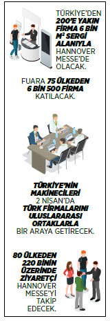 TÜRKİYE’NİN MAKİNECİLERİ’NİN GÖZÜ, 1-5 NİSAN TARİHLERİNDE DÜZENLENECEK HANNOVER MESSE FUARINDA OLACAK. ENDÜSTRİYEL ZEKÂ TEMASIYLA GERÇEKLEŞECEK OLAN HANNOVER MESSE FUARINA 200’E YAKINI TÜRKİYE’DEN OLMAK ÜZERE 75 ÜLKEDEN 6 BİN 500 FİRMANIN KATILMASI; FUARI 80 ÜLKEDEN 220 BİNİN ÜZERİNDE ZİYARETÇİNİN TAKİP ETMESİ BEKLENİYOR. FUARDA, TÜRKİYE’NİN MAKİNECİLERİ DE STAND VE REKLAMLARIYLA YER ALACAK.