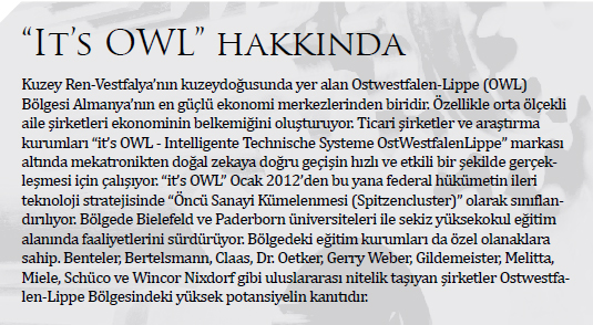 Kuzey Ren-Vestfalya’nın kuzeydoğusunda yer alan Ostwestfalen-Lippe (OWL) Bölgesi Almanya’nın en güçlü ekonomi merkezlerinden biridir. Özellikle orta ölçekli aile şirketleri ekonominin belkemiğini oluşturuyor. Ticari şirketler ve araştırma kurumları “it’s OWL - Intelligente Technische Systeme OstWestfalenLippe” markası altında mekatronikten doğal zekaya doğru geçişin hızlı ve etkili bir şekilde gerçekleşmesi için çalışıyor. “it’s OWL” Ocak 2012’den bu yana federal hükümetin ileri teknoloji stratejisinde “Öncü Sanayi Kümelenmesi (Spitzencluster)” olarak sınıflandırılıyor. Bölgede Bielefeld ve Paderborn üniversiteleri ile sekiz yüksekokul eğitim alanında faaliyetlerini sürdürüyor. Bölgedeki eğitim kurumları da özel olanaklara sahip. Benteler, Bertelsmann, Claas, Dr. Oetker, Gerry Weber, Gildemeister, Melitta, Miele, Schüco ve Wincor Nixdorf gibi uluslararası nitelik taşıyan şirketler Ostwestfalen- Lippe Bölgesindeki yüksek potansiyelin kanıtıdır.