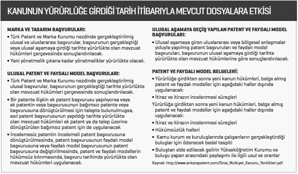 Mülkiyet Kanunu, yılın son günlerinde TBMM’de üç gün süren görüşmelerin ardından kabul edilerek yasalaşmıştı. Kanun, Cumhurbaşkanı Recep Tayyip Erdoğan’ın onayının ardından 10 Ocak tarihli Resmi Gazete’de yayımlanarak yürürlüğe girdi. 6769 sayılı Sınai Mülkiyet Kanunu ile marka, coğrafi işaret, tasarım, patent, faydalı modele ilişkin hakların korunması ve bu suretle teknolojik, ekonomik ve sosyal ilerlemenin gerçekleştirilmesine katkı sağlanması amaçlanıyor. Kanun, marka, coğrafi işaret, tasarım, patent, faydalı model ile geleneksel ürün adlarına ilişkin başvuruları, tescil ve tescil sonrası işlemleri ve bu hakların ihlaline dair hukuki ve cezai yaptırımları da kapsıyor. Sınai Mülkiyet Kanunu ile ayrıca Türk Patent Enstitüsü’nün adı “Türk Patent ve Marka Kurumu” olarak değiştirildi. Kurumun kısa adı ise “Türk Patent” olarak düzenlendi.