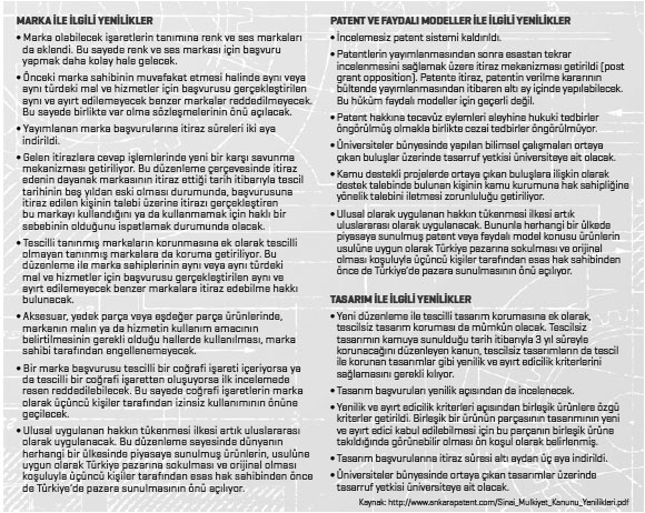Destek Patent Yönetim Kurulu Başkanı Kemal Yamankaradeniz, “Güçlü bir sınai mülkiyet sistemi, hızlanan başvuru ve tescil süreçleri, yeterli uzman kadrosuna sahip etkin bir Türk Patent ve Marka Kurumu (TPMK), uluslararası entegrasyon, ilkeli çalışma sistemine dahil olan vekillik sistemi ve hızlı çalışan ihtisas mahkemeleri. Bu şartların yerine gelmesi için bu Kanun gerekli zemini oluşturmaktadır” derken, Ankara Patent Bürosu Yönetim Kurulu Başkanı Kaan Dericioğlu ise yeni Kanun’un fikri ve sınai mülkiyet hakları konusunda bilincin oluşturulmasına katkı sağlayabileceğinin altını çizdi. Kanun’un tam metnine, http://www.resmigazete.gov. tr/eskiler/2017/01/20170110-9.htm İnternet adresinden ulaşılabilir.