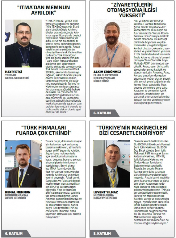 Fuara ilişkin bir değerlendirmede bulunan MAİB Yönetim Kurulu Başkanı Kutlu Karavelioğlu, Türkiye’nin Orta Doğu’dan Avrupa ve Uzak Asya’ya kadar dünyanın farklı bölgelerine tekstil ve konfeksiyon makinesi ihraç ettiğini belirtirken, “Tekstil ve konfeksiyon makineleri alanında geliştirdiğimiz ileri teknolojili ürünlerimiz ve faaliyet alanında markalaşma stratejisi yürüten firmalarımız öncülüğünde, tüm dünyaya ihracat yapmanın gururunu yaşıyoruz. 2018’de 722 milyon dolara ulaşan tekstil ve konfeksiyon makineleri ihracatımızı 1 milyar dolara çıkaracak gücümüz var. Makinelerimizin yüksek üretim performansı ve farklı tasarımlara hizmet verebilecek esnek yapısı, bizleri bu seviyeye kısa vadede taşıyacaktır” dedi. Türk firmaların ITMA’da sergiledikleri yeni ürünlere yoğun ilgi ve talep olduğuna da dikkat çeken Karavelioğlu şunları söyledi: “Bu yılın ilk beş ayında tekstil ve konfeksiyon makineleri ihracatımız miktar bazında yüzde 26 arttı. Daha önce dört makine gönderdiğimiz yere, artık beş makine gönderiyoruz. Bu sayı daha da artacak; makinelerimizin gerçek değerine ulaşmasıyla birlikte değer bazında sağladığımız yüzde 15 artış da yükselecektir. Pazarlık gücümüzü koruyabilmek için iç piyasadaki talebin korunmasına ihtiyacımız var. Oysa Türkiye her yıl tekstil ve konfeksiyon makineleri alanında 1 milyar dolar dış ticaret açığı veriyor. Türk makinelerinin kalitesini tüm dünya anladı, tekstil ve konfeksiyon üreticilerimizin de bize güvenmesi gerekiyor.”