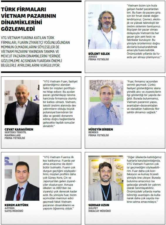 Tekstil makine-aksesuarları, ağartma-yıkama makineleri, boya ve kimyasallar, kumaş imalat makine-aksesuarları, nakış işleme ekipmanları, keçe, iplik ekipmanları, dokuma tezgâhları, örme makineleri ile lif, iplik ve dokuma gibi başlıklarını temsil eden 10 ülkeden 500 firmanın yer aldığı fuara, Türkiye’den de beş firma katılarak ürünlerini sergiledi. Fuara, Türkiye’nin Makinecileri’ni temsilen Yönetim Kurulu Başkan Yardımcısı Mehmet Ağrikli ile Makine Şubesi Uzmanları Aybüke Tuğçe Karabörk ve Bahar Özcan Kaynak katılarak, ziyaretçilere Türk makine sektörü ve üyeleri hakkında bilgi verdi. Fuar süresince ayrıca, Vietnam Sanayi ve Ticaret Bakanı’nın yanı sıra Hanoi Ticaret Müşaviri Volkan Şentürk de Türkiye’nin Makinecileri’nin standını ziyaret etti ve Mehmet Ağrikli ile temaslarda bulundu.