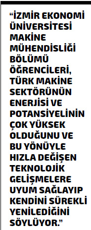 İZMİR EKONOMİ ÜNİVERSİTESİ MAKİNE MÜHENDİSLİĞİ BÖLÜMÜ ÖĞRENCİLERİ; BÖLÜMLERİNİN, HENÜZ YENİ KURULMASINA RAĞMEN KISA BİR SÜRE İÇERİNDE EKSİKLERİNİ TAMAMLAYARAK DÜNYA STANDARTLARINDA BİR MAKİNE MÜHENDİSLİĞİ EĞİTİMİ VERMEYE BAŞLADIĞINI SÖYLERKEN, EĞİTİM DİLİNİN TAMAMEN İNGİLİZCE OLMASININ DA KENDİLERİNE ÖNEMLİ BİR AVANTAJ SAĞLAYACAĞINI VURGULUYOR.