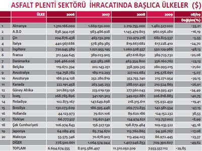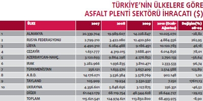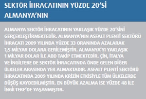Türkiye’nin asfalt plenti sektörü ihracatı 2008 yılında 124 milyon dolar olarak gerçekleşti. 2009 yılında sektör ihracatı yüzde 9 oranında azaldı ve 113 milyon dolar seviyesine geriledi. Ancak asfalt plentleri sektörünün önümüzdeki 5-6 yıl içerisinde de yoğun bir çalışma temposunda olacağı tahmin ediliyor.