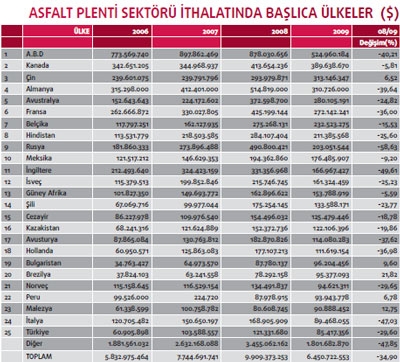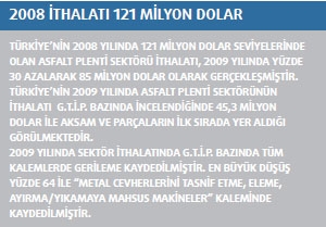 2009 yılı sektör ithalatında 25. sırada bulunan Türkiye’nin, 2008 yılında ithalatı 121 milyon dolar iken 2009 yılında bu rakam yüzde 30 oranında azalarak 85 milyon dolara ulaşmıştır. 2008 ve 2009 yıllarında G.T.İ.P bazında en fazla ithal edilen asfalt plenti sektörü “8474.90 – Aksam ve Parçalar” olduğu görülmektedir.