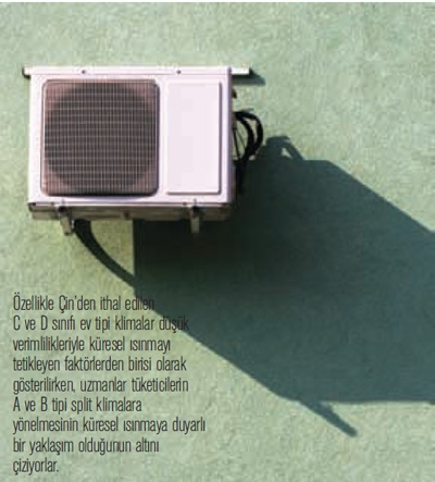 Yukarıdaki soru ısıtma, soğutma ve iklimlendirme sektörünün yanıt aradığı sorulardan birisi niteliğinde. Küresel ısınmanın asıl sebebi her ne kadar fosil yakıtların kullanımı ve atmosfere salı- nan sera gazlarının artması olarak gösterilse de değişen iklim koşullarıyla beraber insanların klimaya yönelik taleplerinin artması ve klima kullanımının da küresel ısınmanın artmasındaki minör etkenlerden birisi olarak gösterilmesi bu sorunun sorulmasına sebebiyet veriyor. Isıtma, soğutma ve iklimlendirme cihazı üreticileri ise bu konuda bazı düzenlemelerin yapılması gerektiğini belirtiyorlar. Uzmanlar daha verimli klima kullanımının hem ülkemiz, hem tüketicimiz, hem de çevremiz için faydalı ve gerekli bir uygulama olduğu görüşünde. Türkiye açısından da yukarıdaki soru özellikle iç piyasada son 5 yılda 7 kat artan klima cihazı satışları dikkate alındı- ğından daha sık bir şekilde sorulur hale gelmiş bulunuyor. Esasında bu sorunun yanıtı oldukça basit. Tüm dünyada ev tipi klimalar A, B, C, ve D grupları olarak sınışandırılıyor. Türkiye’de ağırlıklı olarak yüksek verimli ve enerji tüketimi oldukça düşük olan A ve B grupları üretiliyor. C ve D gruplarına ait olan ve düşük verimli klimalar ise başta Çin ve Uzak Doğu olmak üzere genelde yurtdı- şından geliyor. Dolayısıyla içerideki üretimin daha yüksek kalitede olduğu ve ev tipi klima üretiminde ülkemizde bir sorun yaşanmadığını rahatlıkla söylenebilir. Ancak ucuz olması nedeniyle tüketicilerin Uzak Doğu’dan gelen ürünleri tercih etmesi ülkemiz açısından küresel ısınmayı tetikleyen bir etmen olarak nitelendiriliyor. Ancak, büyük, sanayi tipi diye tarif edilen klimaların imalatında Türkiye’de önemli sıkıntılar yaşanıyor. Zira bu tip klimalarda çevreye duyarlı ve yüksek verimli üretim yapmanı n maliyeti bir hayli yüksek. Dolayı- sıyla Türk ısıtma, soğutma ve iklimlendirme sektörü burada yüksek verimli üretime geçiş için bir sürece ihtiyaç duyuyor. Bu süreç tamamlandığında sanayi tipi klimalarda da A ve B grubu üretimleri başlayacak. Ancak olaya ev tipi klimaların tüketicileri açısından bakıldı- ğında tüketiciyi verimli klimalara yönlendirmek adına, düşük verimli klimalara vergi artırımı getirmek gibi uygulamalar hayata geçirildiği taktirde bu sorun da çözülebilir. Bu çalışmaların sonuçları da yavaş yavaş alınıyor denilebilir. Zira yaz sezonuna girdiğimiz şu günlerde üretici firmaların ürün kampanyaları nda ön plana çıkardıkları faktörlerden birisinin de yüksek verimlilik olduğunu görmek bu bilincin yavaş yavaş oturduğunu ispatlar nitelikte.