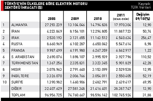Türkiye ise genel elektrik motoru ihracatında 37’nci sıraya yükseldi. Ülkemizin genel elektrik motoru ihracatı 2009 yılında 75 milyon dolardı. 2010 yılında ise sektör rekor bir artışoranını yakalayarak yüzde 24 pay aldı. Türkiye’nin elektrik motoru ihracatı 2010 yılında 98 milyon dolara yükseldi. Dünya elektrik motoru ihracatında ise 2010 yılında yalnızca bir ülkede azalış görüldü. Fransa yüzde 0,5 oranında geriledi.